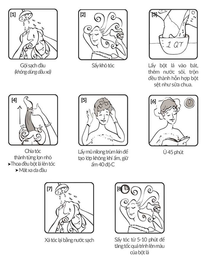 Sản phẩm bột lá nhuộm tóc dùng để phủ bạc mái tóc rất tốt. Khi nhuộm bằng bột lá móng sẽ cho ra mái tóc màu nâu đỏ, khi nhuộm bằng bột lá chàm cho mái tóc màu xanh đen (màu chàm). Khách hàng có thể lựa chọn sản phẩm đã mix sẵn giữa bột lá móng và bột lá chàm để cho ra mái tóc có Màu Nâu hoặc Màu Đen